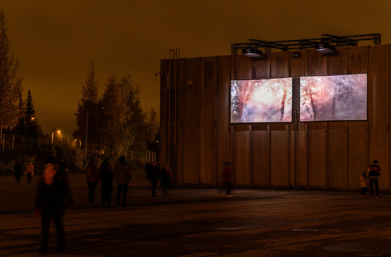 Two big screens glow with images of forests, contrasting the man-made environment around them. The candy-coloured scenes function as an object of desire and a warning of future disasters.