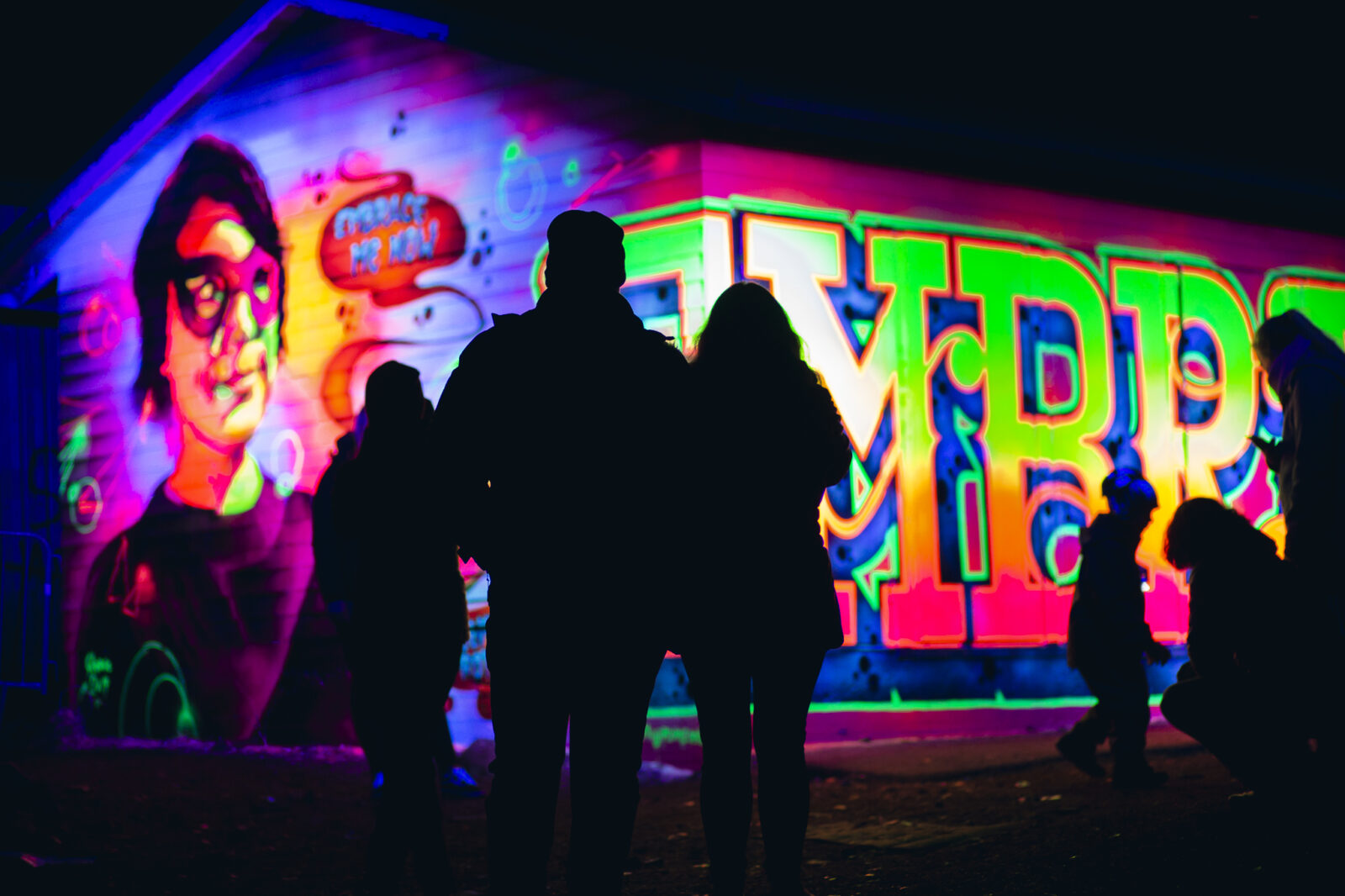 ’Ultraviolet Gallery’ is a series of works focusing on ultraviolet light art. The gallery enhances the local urban qualities while adding new dimensions to the atmosphere of the skate park. By repainting existing graffiti works with fluorescent paint the existing graffiti turn into glowing new light art pieces.