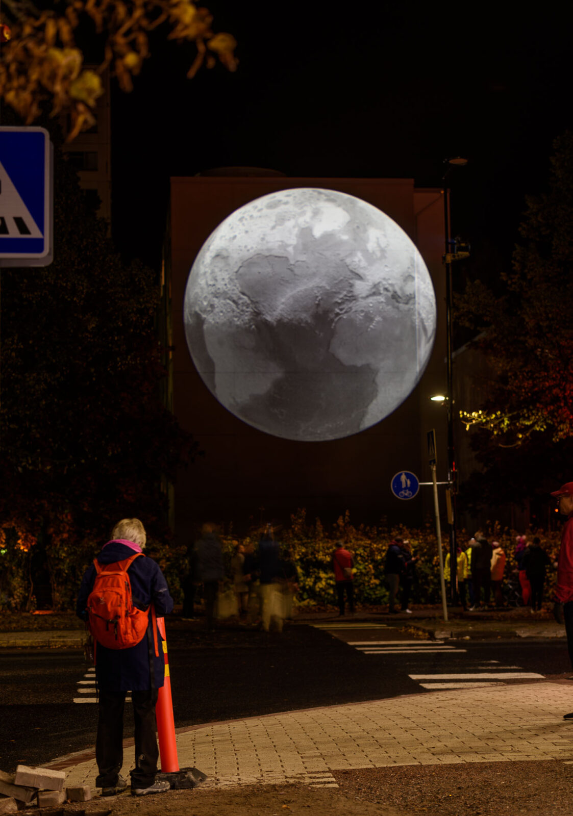 Katsoja näkee kaukaa planeetan siluetin suurelle seinälle projisoituna. Kuva näyttää tutulta: puolikuun muotoinen valonlähde täydellisen pallon pinnalla, sen täytyy olla kuu. Teosta lähestyttyään katsoja löytää kraatterimaisia yksityiskohtia, hienovaraisten varjojen luomia epäsäännöllisyyksiä ja kohokuvia. Läheltä ja tarkkaan tutkimalla voi tunnistaa maanosien, merien ja valtamerien ääriviivat. Lopulta näkyville jäävät katastrofien jäljet: yksivärinen sävyttömyys paljastaa ilmakehän puuttumisen, valtamerten katoamisen. Katsojan tehtäväksi jää kuvitella, mitä tämä kuva reagoimattomasta planeetasta kätkee taakseen. Taiteilija kutsuu meidät pohtimaan mahdollista tulevaisuutta.