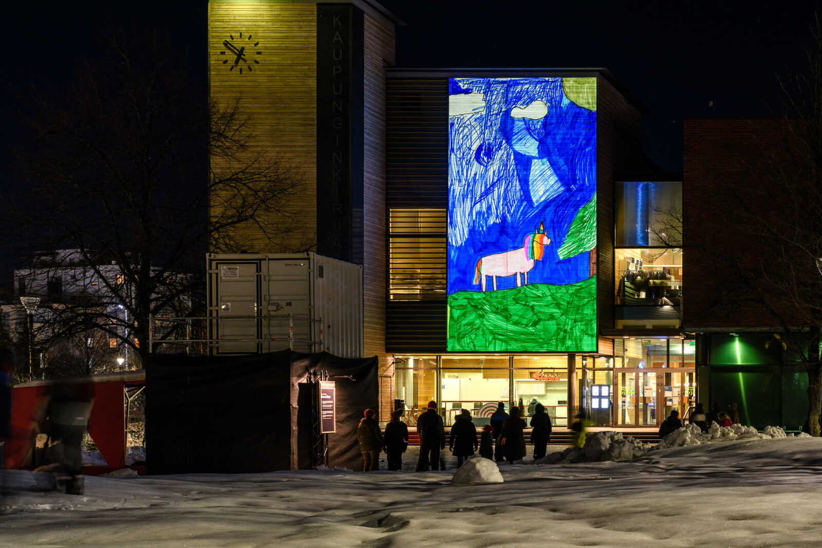 Kerava Maps is a communal visual art project created in collaboration between Reflektor and Kerava elementary schools. A total of 100 students have participated in the project by creating works using techniques of their choice to be projected onto the facade of the Kerava Library. Goals of the project are to transform the urban space with art and to increase cultural participation of local residents. Furthermore, the project aims to create memories for future light and video artists, and to promote the general awareness of the art form.