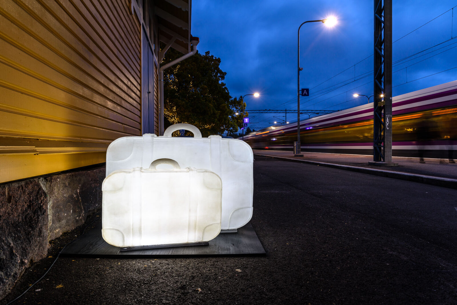 Two lonely suitcases, lit from the inside, illuminate the autumn night. They look as if they have been used by someone; as if their former contents have bulged out their shape. A suitcase can hold a lifetime. The things we collect, the things we need, are the things we remember. We try to hold on to these things, especially when we lose our home and when it is uncertain where our future lies. Our time now, it is changing. People are adrift because of war or poverty. Standing at this point, as an artist, I want to create a momentum with this work, where we can think about where we come from, where we are now, and where we are going. What things should we leave behind, and what should we bring?”