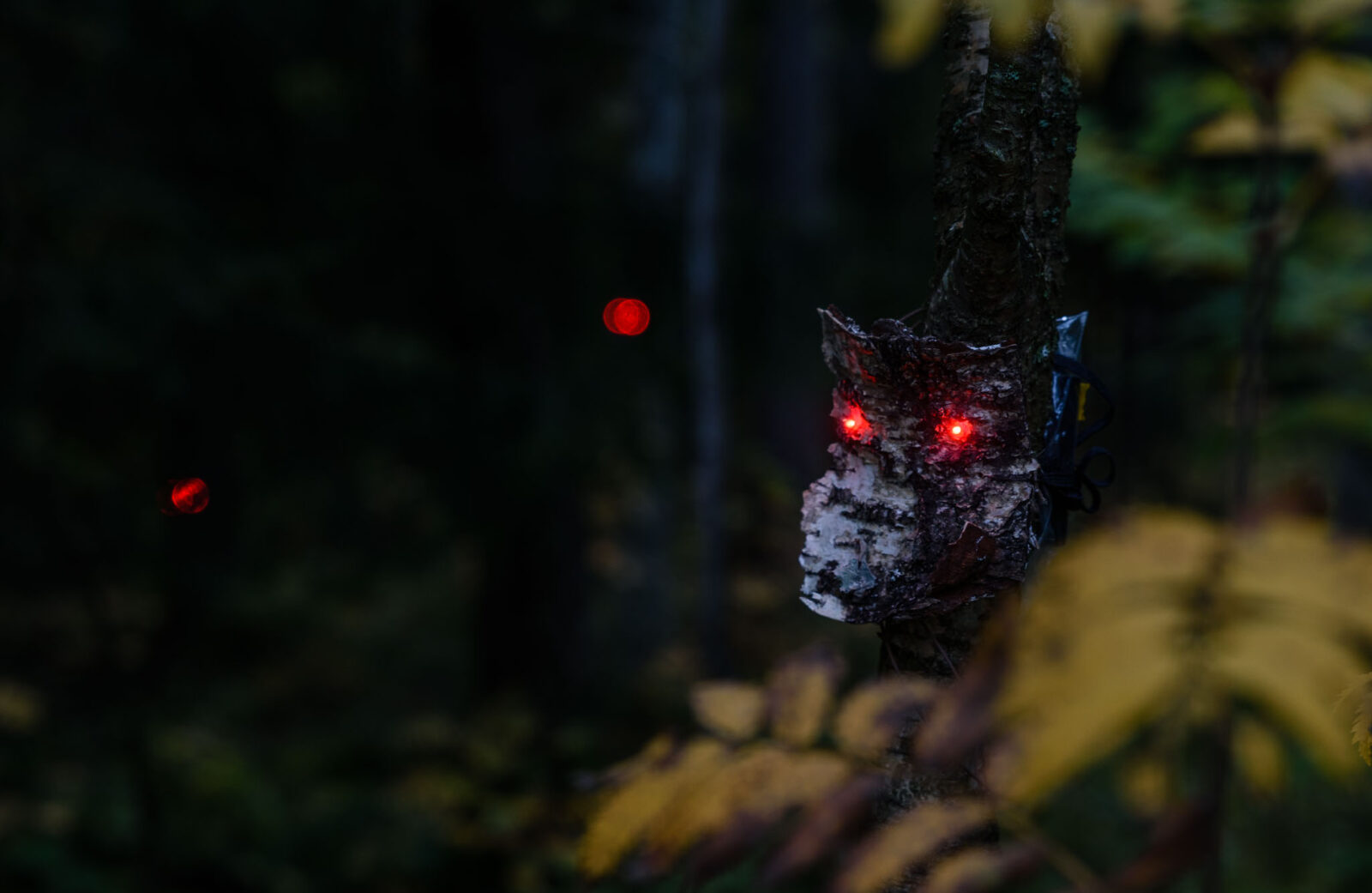 The eyes light up again. The site-specific work is a sequel to Who’s There? installations. Forest beings are concerned about the accelerating consequences of global warming. Among other things, forest fires around the world are destroying nature and narrowing living space, causing suffering, misery and death. The glowing red eyes can be interpreted as expressing anxiety or some other strong feeling.